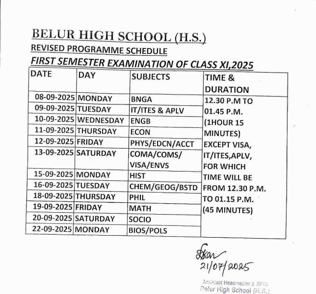 Description: Routine of SEMESTER-I examination of class XI(2025)